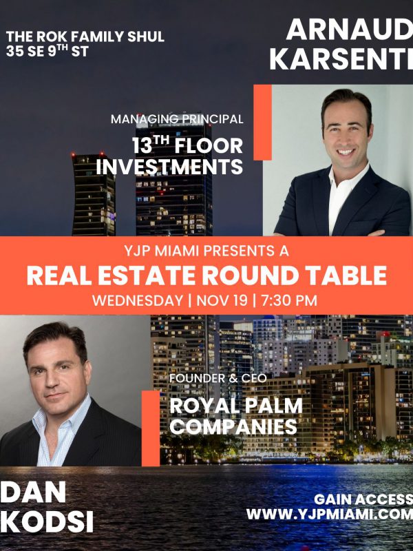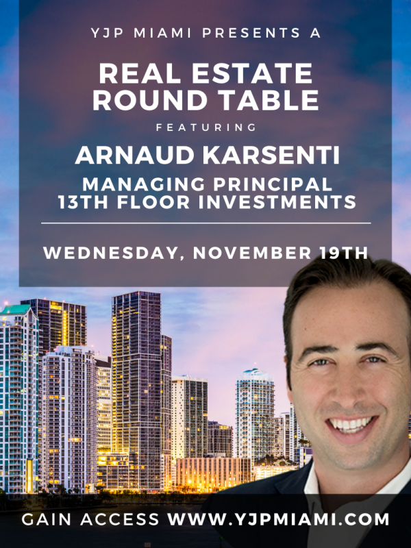 YJP Miami is hosting a Real Estate Roundtable featuring Arnaud Karsenti, Managing Partner of 13th Floor Investments. We will bring together an impressive and powerful group of individuals & Real Estate Executives. Meet and network with young professionals in the Real Estate sector!