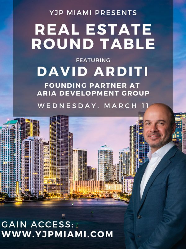 YJP Miami is hosting a Real Estate Roundtable featuring David Arditi, founding partner at Aria Development Group. We will bring together an impressive and powerful group of individuals & Real Estate Executives. Meet and network with young professionals in the Real Estate sector!